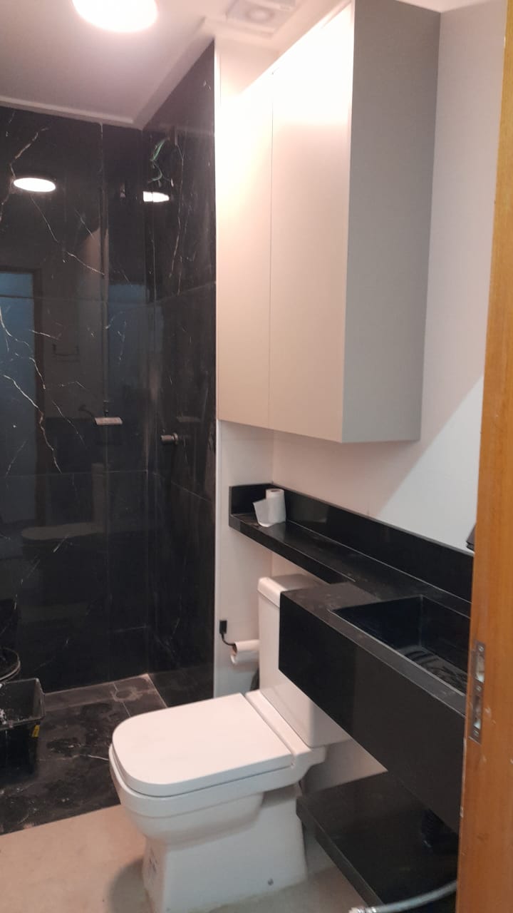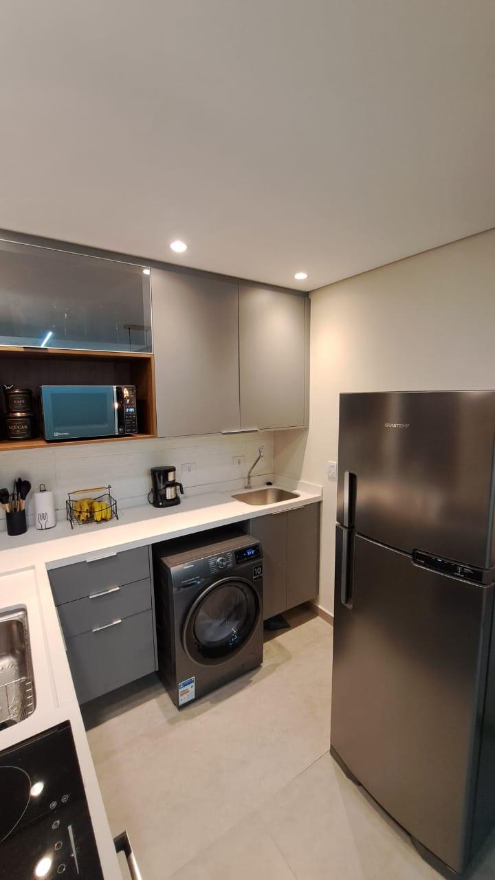 O cliente desejava móveis planejados para a cozinha integrada à lavanderia, banheiro e quarto, com foco total em funcionalidade e otimização dos espaços. O pedido principal era por soluções inteligentes, que facilitassem a rotina e mantivessem os ambientes organizados, sem abrir mão da estética. A paleta de cores solicitada foi neutra e sofisticada, com predominância de tons de cinza e preto, refletindo um estilo urbano e contemporâneo.